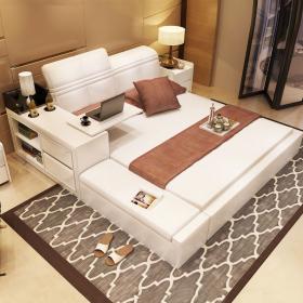 创意真皮床双人床现代婚床1.8米1.5榻榻米床储物床皮艺床软床大床 床侧储物 升降靠背 双ll价格 更低