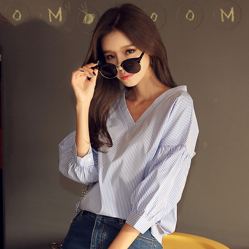 韩都衣舍2017韩版女装春装新款条纹显瘦百搭宽松v领七分袖衬衫潮 领券立减/单件包邮/七天无理由退换